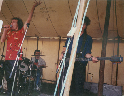 Martin Newell playing with Nelson from New Model Army on bass, Nigel from The Lurkers on drums and Captain Sensible.